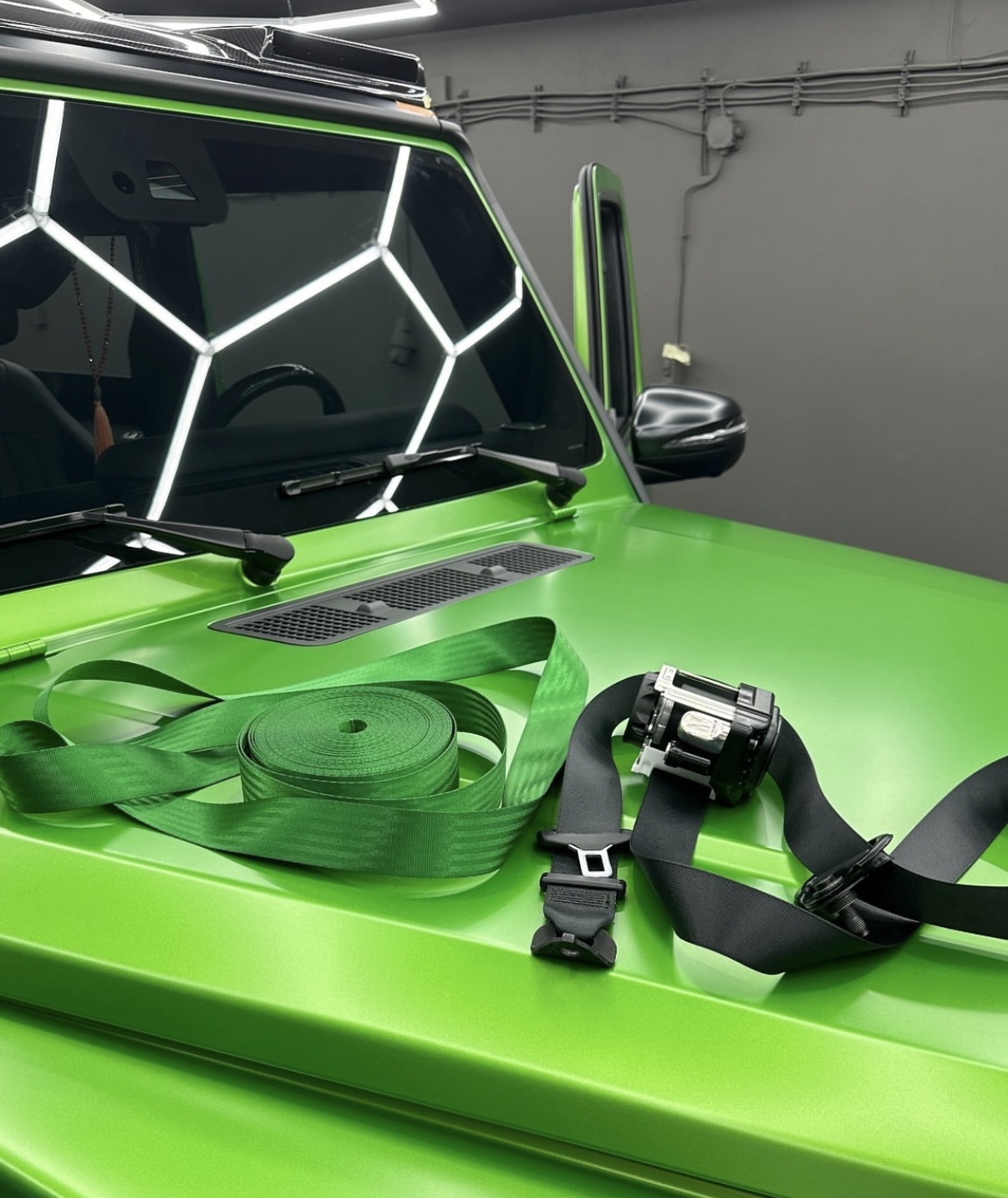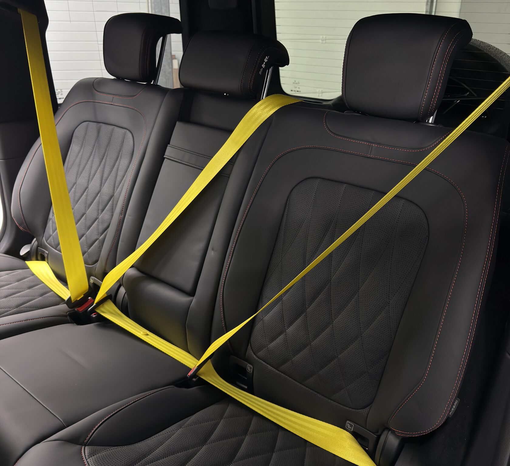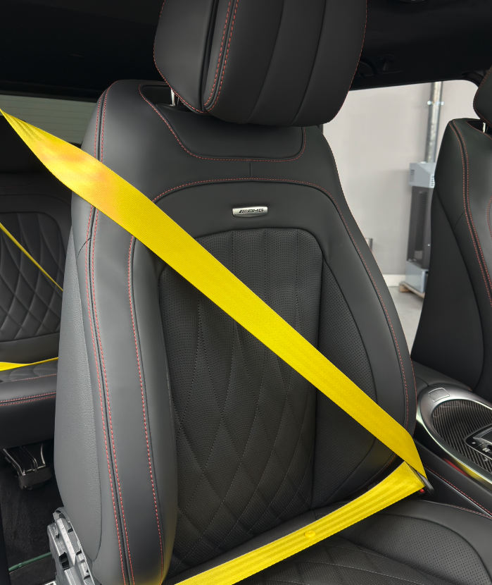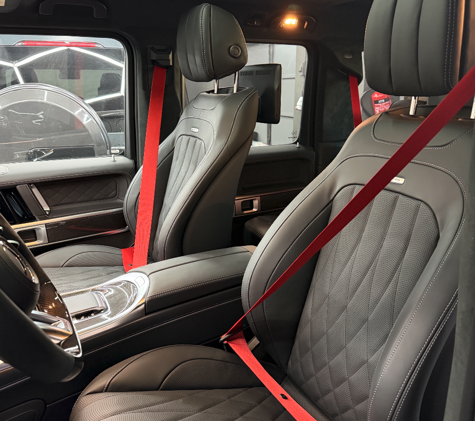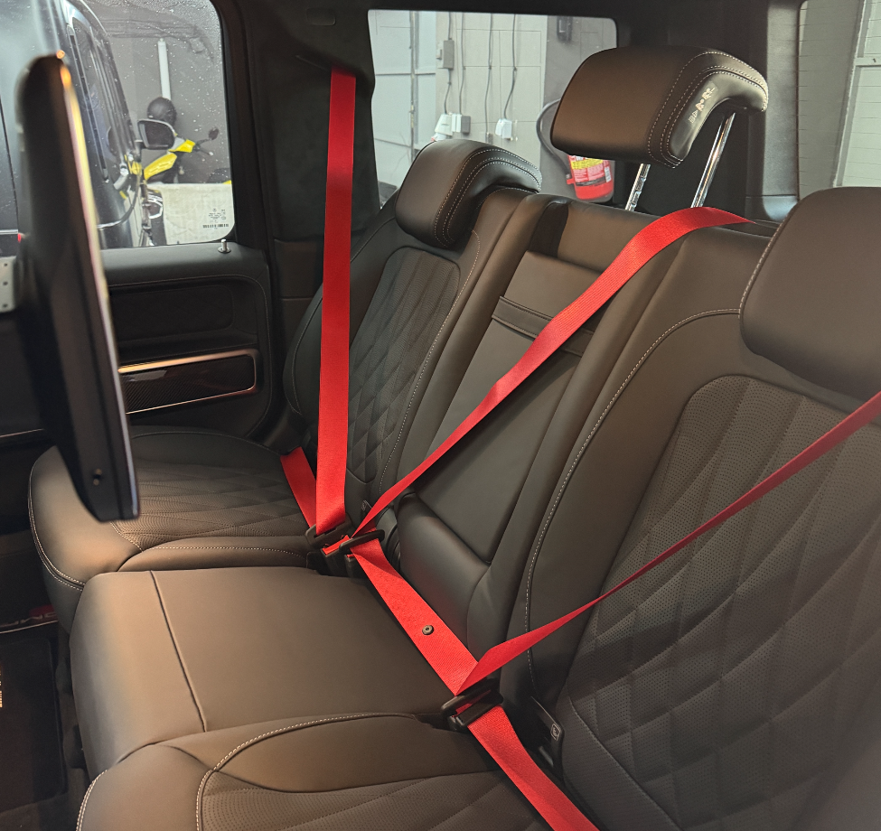 Na fotografiích můžete vidět jeden z našich projektů — výměnu bezpečnostních pásů na voze Mercedes-Benz G-Class. Pro tento automobil jsme instalovali pásy v barvách červená, žlutá a zelená, které výrazně oživily interiér a dodaly mu exkluzivní vzhled.